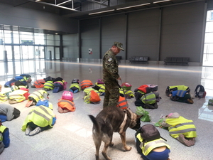 W trakcie spotkania funkcjonariusze Placówki SG w Katowicach - Pyrzowicach zapoznali gości z infrastrukturą lotniska, zasadami bezpieczeństwa, procedurą odprawy granicznej oraz kontroli podróżnego. Dzieci miały również możliwość zobaczyć sprzęt wykorzystywany na co dzień przez Zespół Interwencji Specjalnych - robota pirotechnicznego, kombinezon EOD, broń krótką i długą. Funkcjonariusz - przewodnik psa służbowego zaprezentował pokaz wyszkolenia swego podopiecznego oraz omówił zasady bezpiecznego zachowania się w przypadku kontaktu z nieznanym lub agresywnym psem.