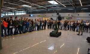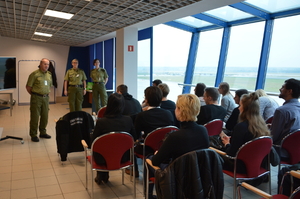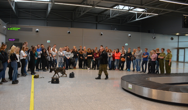 Studenci w trakcie wizyty na lotnisku zostali zapoznani z ogólną charakterystyką funkcjonowania Międzynarodowego Portu Lotniczego i Placówki Straży Granicznej w Katowicach-Pyrzowicach. Goście poznali zasady działania punktu kontroli bezpieczeństwa, osobiście poddając się kontroli. Mieli również okazję zobaczyć sprzęt wykorzystywany przez funkcjonariuszy z Zespołu Interwencji Specjalnych, a funkcjonariusz - przewodnik psa służbowego, wyszkolonego do wykrywania narkotyków, zaprezentował pokaz umiejętności swego podopiecznego. Studenci spotkali się również z Komendantem Placówki.