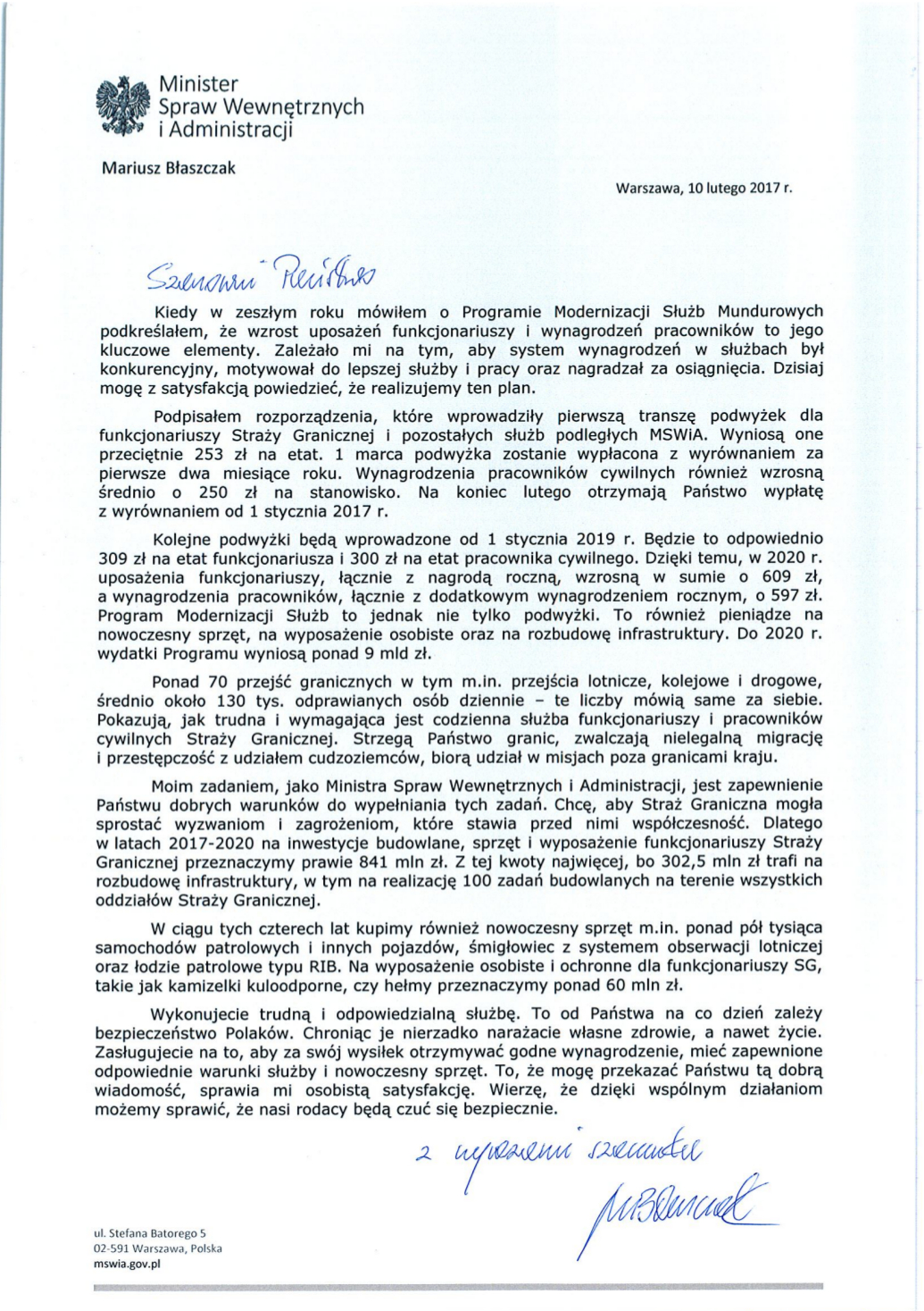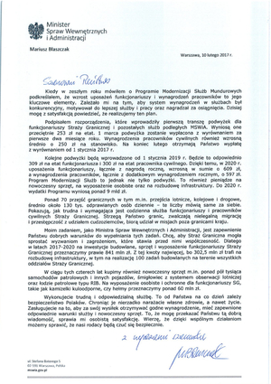 W liście skierowanym do funkcjonariuszy i pracowników cywilnych Straży Granicznej minister Mariusz Błaszczak poinformował o wprowadzonych podwyżkach wynagrodzeń oraz przeznaczeniu kwoty ponad 840 mln zł na planowaną w latach 2017-2020 modernizację formacji – rozbudowę infrastruktury, nowoczesny sprzęt i wyposażenie, aby funkcjonariusze mogli pełnić swoją trudną służbę w odpowiednich warunkach.