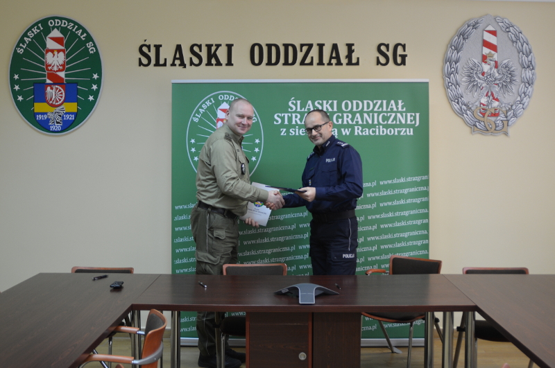 20 lutego w Komendzie Śląskiego Oddziału Straży Granicznej w Raciborzu płk SG Adam Jopek - Komendant Śląskiego Oddziału Straży Granicznej oraz insp. Jarosław Kaleta - Wojewódzki Komendant Policji w Opolu podpisali porozumienie dotyczące zasad współdziałania. Porozumienie określające zakres współpracy pomiędzy Strażą Graniczną i Policją obejmuje między innymi zasady prowadzenia wspólnych działań, przedsięwzięć oraz wymiany informacji. Taka współpraca z pewnością będzie miała wpływ na poprawę skuteczności działań realizowanych przez policjantów i funkcjonariuszy SG na terenie województwa opolskiego.