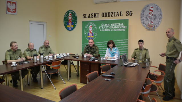 W trakcie swej wizyty w Śląskim Oddziale Straży Granicznej pani Helga Riedel miała okazję zapoznać się ze struktura organizacyjną ŚlOSG, zasięgiem terytorialnym oraz zadaniami realizowanymi na odcinku wewnętrznej granicy Unii Europejskiej. Podczas pobytu w Komendzie Oddziału gościowi zaprezentowano sprzęt wykorzystywany w codziennej służbie oraz pokazano nowoczesną krytą strzelnicę. Wizyta w Sali Tradycji Formacji Granicznych była okazją do przybliżenia Oficerowi Łącznikowemu historii formacji mundurowych, które strzegły polskich granic.