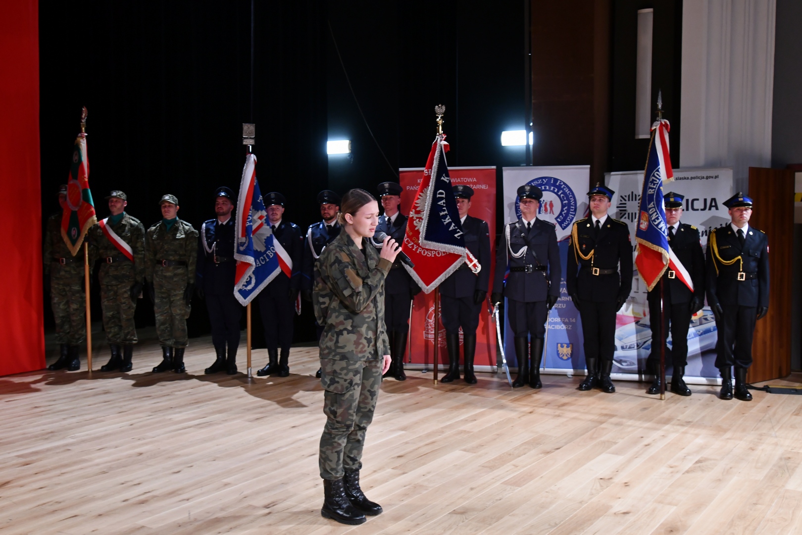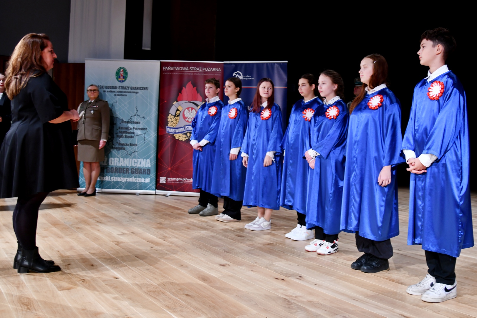 Po przywitaniu przybyłych gości odegrano Mazurka Dąbrowskiego, w trakcie którego tradycyjnie już zaprzyjaźniona z Oddziałem grupa wychowanków Specjalnego Ośrodka Szkolno-Wychowawczego dla Niesłyszących i Słabosłyszących w Raciborzu wykonała hymn Polski w języku migowym.
