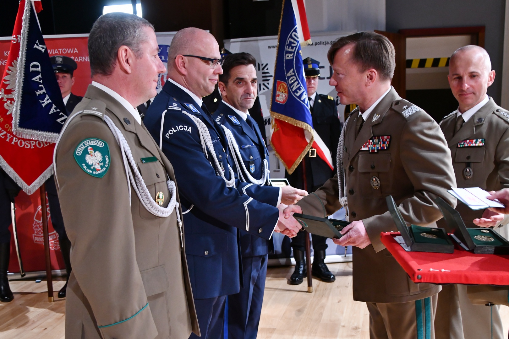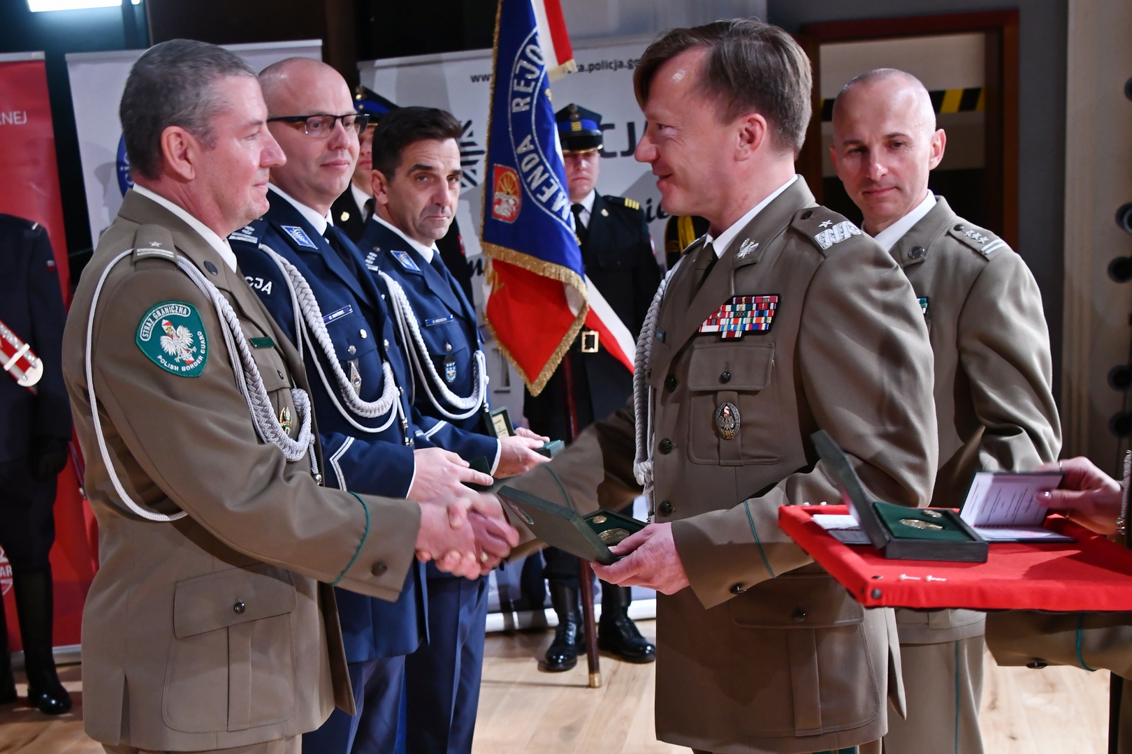 Podczas uroczystości brązowym medalem za zasługi dla obronności kraju został odznaczony Zastępca Komendanta Placówki SG w Katowicach-Pyrzowicach, ppłk SG Grzegorz Dąbek. Medal wręczyli Szef Ośrodka Zamiejscowego w Katowicach Centralnego Wojskowego Centrum Rekrutacji, płk Dariusz Kaminiów oraz gen. bryg. SG Andrzej Jakubaszek.