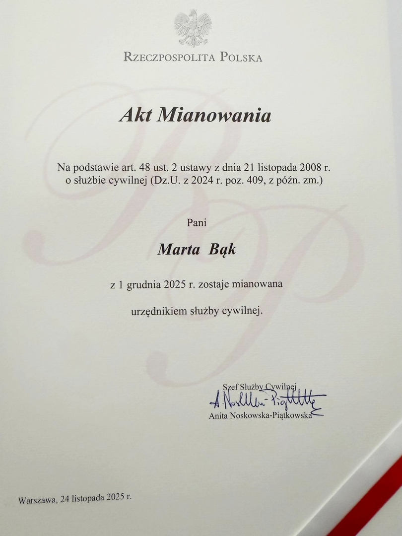 W tym roku szeregi urzędników korpusu służby cywilnej zasiliło aż 468 nowo mianowanych urzędniczek i urzędników. To ponad 86 procent więcej niż w 2024 roku. Wśród 468 osób, które odebrały w tym roku akty mianowania znalazło się 313 kobiet i 155 mężczyzn.