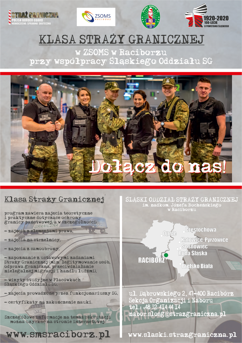 Zespół Szkół Ogólnokształcących Mistrzostwa Sportowego planuje we wrześniu 2020 roku rozpocząć kształcenie uczniów w klasie o profilu Straży Granicznej. Program nauczania opracowany przez funkcjonariuszy Śląskiego Oddziału Straży Granicznej realizowany będzie w ramach przedmiotu uzupełniającego Ochrona granicy państwowej z elementami prawa, który znajdzie się w ofercie szkoleniowej Liceum Ogólnokształcącego Mistrzostwa Sportowego. Podpisanie porozumienia o współpracy pomiędzy Strażą Graniczną a ZSOMS ma na celu wspólne kształtowanie postaw patriotycznych i obywatelskich, pielęgnowanie tradycji narodowych i formacji granicznych, przygotowanie potencjalnych kandydatów do służby w Straży Granicznej oraz wspólne organizowanie wydarzeń o charakterze naukowym i edukacyjnym. W ramach współpracy funkcjonariusze Straży Granicznej będą udzielać merytorycznej i praktycznej pomocy w organizacji zajęć lekcyjnych, związanych z zagadnieniami służby granicznej. Uczniowie klas o profilu Straż Graniczna będą mieli możliwość bezpośredniego zapoznania się ze specyfiką służby w Straży Granicznej. Zajęcia lekcyjne będą odbywały się również w obiektach Śląskiego Oddziału Straży Granicznej, gdzie każdy uczeń pozna zróżnicowany charakter służby w SG – od kontroli granicznej i zapewnienia bezpieczeństwa podróżnym w Międzynarodowym Porcie Lotniczym Katowice w Pyrzowicach do prowadzenia działań związanych ze zwalczaniem i przeciwdziałaniem nielegalnej migracji. Ponadto młodzież będzie uczestniczyła w zajęciach strzeleckich na nowoczesnej strzelnicy i trenażerze laserowym oraz w zajęciach z taktyk i technik interwencji, które prowadzone będą przez instruktorów z ŚlOSG.