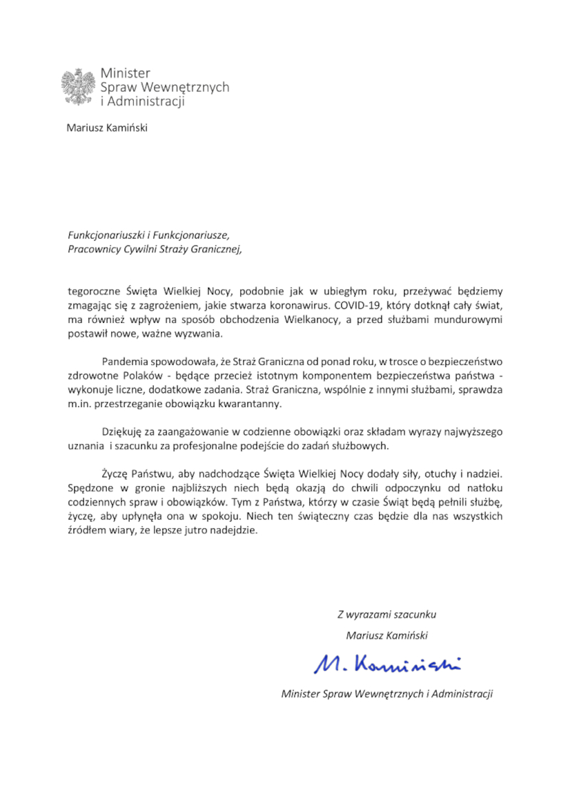 Minister Spraw Wewnętrznych i Administracji Mariusz Kamiński przesłał list z życzeniami dla funkcjonariuszy i pracowników Straży Granicznej.