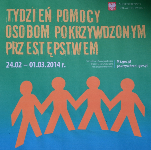 Przed nami kolejny „Tydzień Pomocy Osobom Pokrzywdzonym Przestępstwem”. W tym roku każdy zainteresowany będzie mógł zgłosić się o poradę w dniach od 24 lutego do 1 marca 2014 roku. W organizację obchodów – poza Ministerstwem Sprawiedliwości - aktywnie włączyły się: Prokuratura Generalna, Rzecznik Praw Obywatelskich, Rzecznik Praw Dziecka, Komenda Główna Policji, Krajowa Rada Kuratorów, Naczelna Rada Adwokacka, Krajowa Rada Radców Prawnych, Krajowa Rada Notarialna, Komenda Główna Straży Granicznej i Krajowa Rada Komornicza. W tym roku w dniach 24 lutego – 1 marca zainteresowani będą mogli zgłaszać się po pomoc do Ośrodków Pomocy dla Osób Pokrzywdzonych Przestępstwem. W ośrodkach będą pełnione dyżury od poniedziałku do piątku w godzinach od 10:00 do 18:00 oraz w sobotę w godzinach od 10:00 do 13:00.