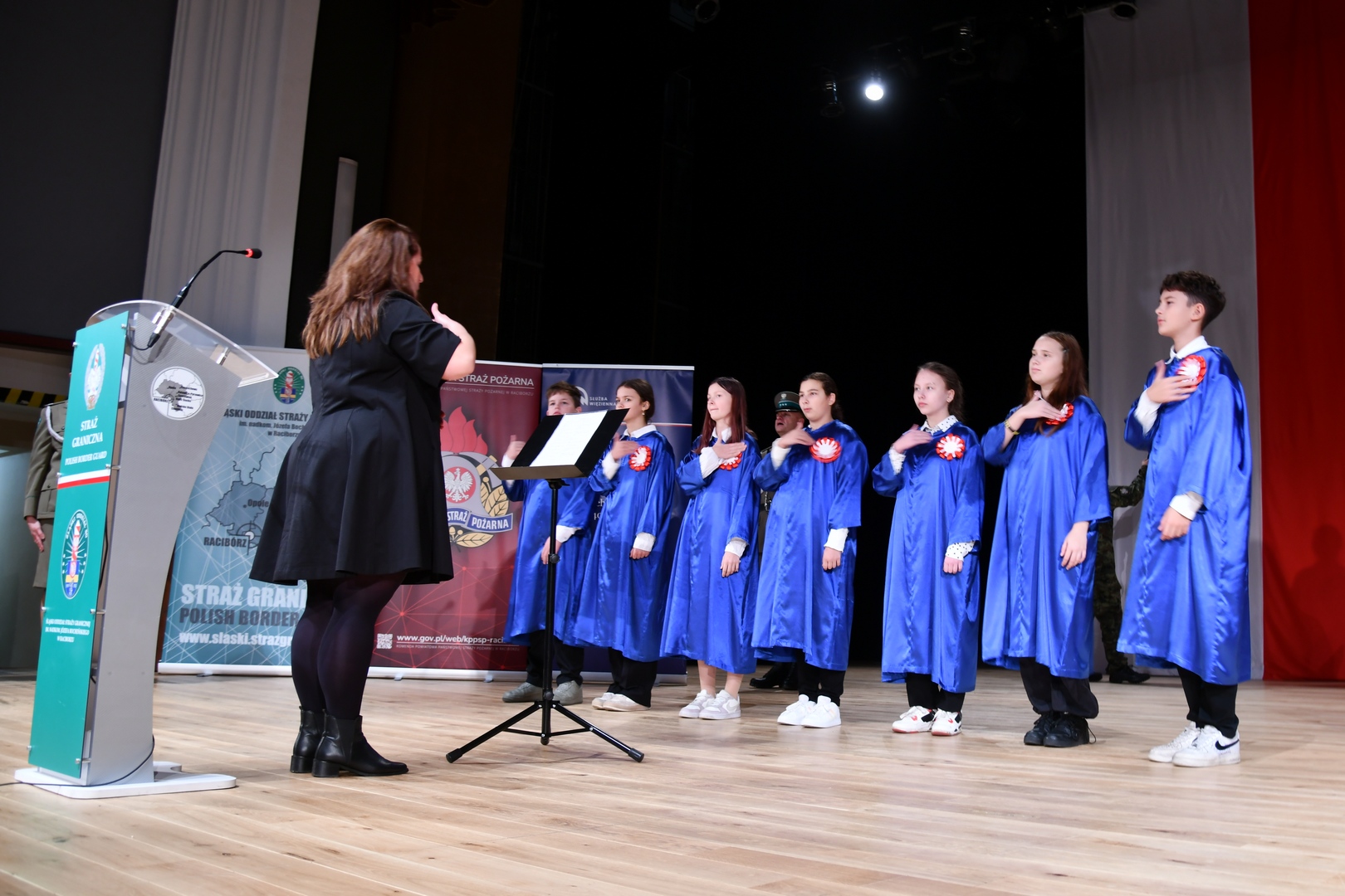 Po przywitaniu przybyłych gości odegrano Mazurka Dąbrowskiego, w trakcie którego tradycyjnie już zaprzyjaźniona z Oddziałem grupa wychowanków Specjalnego Ośrodka Szkolno-Wychowawczego dla Niesłyszących i Słabosłyszących w Raciborzu wykonała hymn Polski w języku migowym.