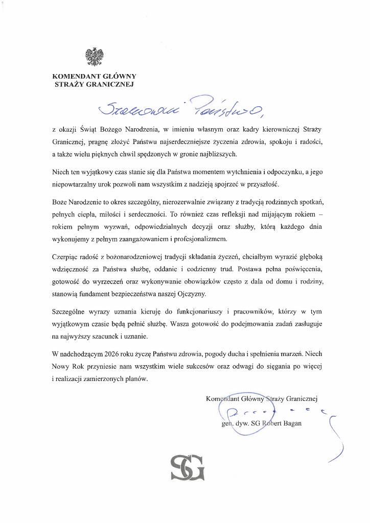 Życzenia Komendanta Głównego Straży Granicznej z okazji Świąt Bożego Narodzenia